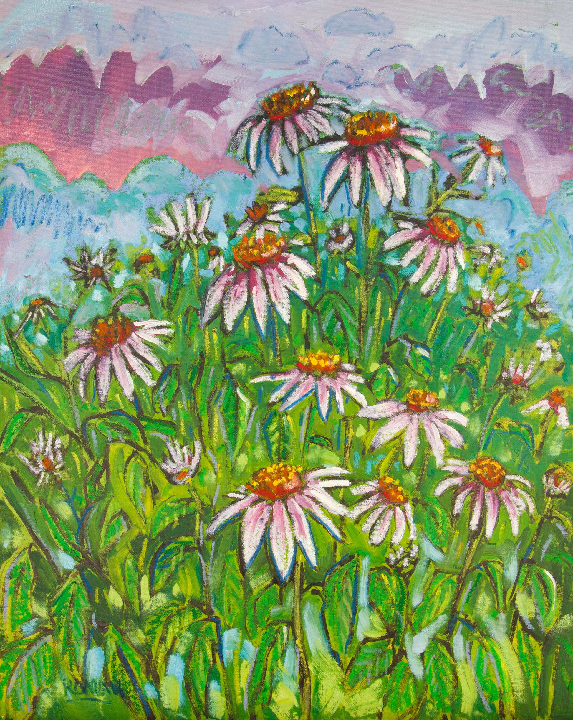 A vibrant field of purple coneflowers reaches toward a dramatic pink and lavender sky in this impressionistic painting inspired by a walk through downtown Charlevoix, Michigan. Bold brushwork in oils, acrylics, and oil pastels on canvas panel captures the energy and color of a garden refreshed by rain.