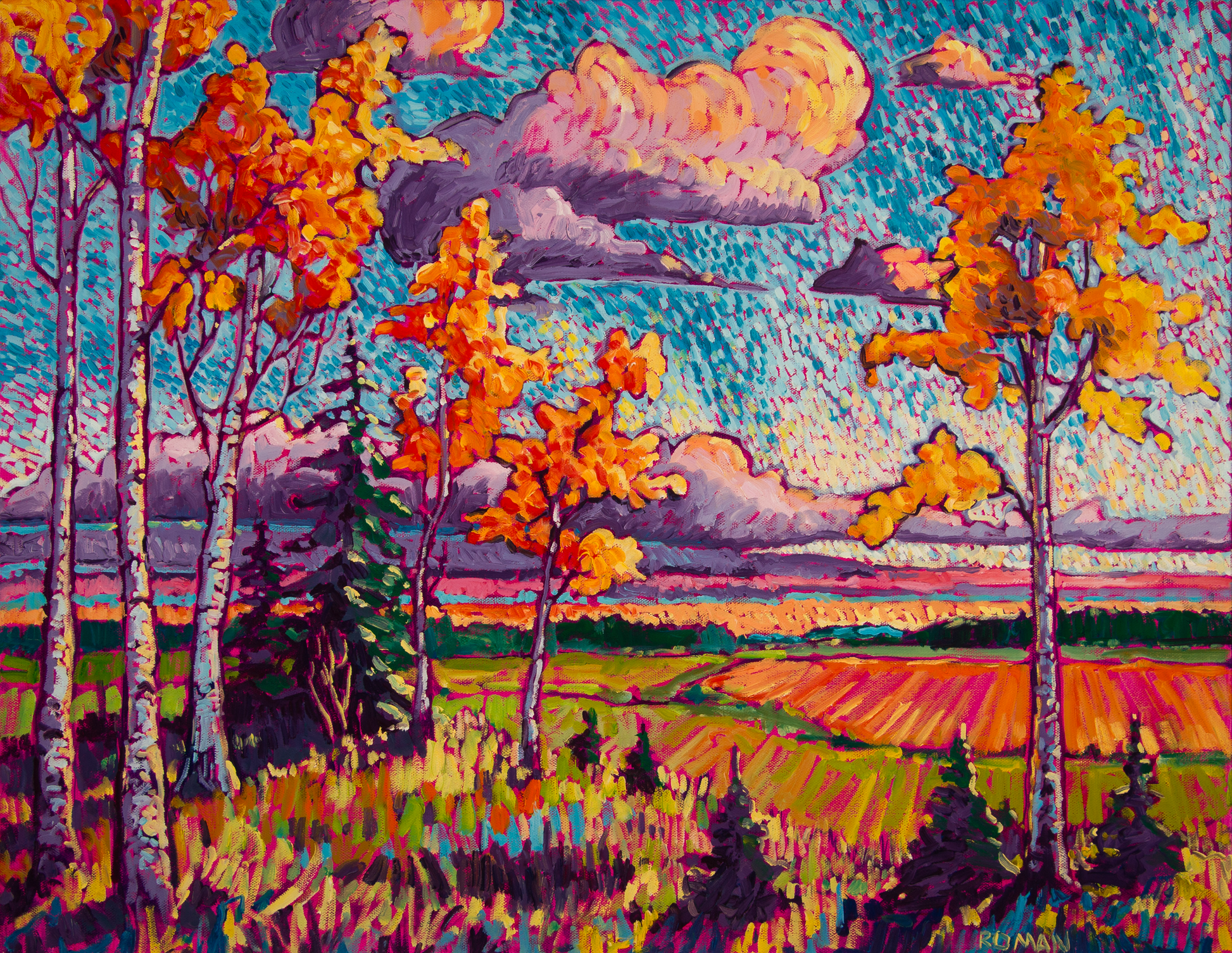 Experience the vibrant energy of autumn with this stunning original oil painting. Rich oranges, deep purples, and lush greens dance across the canvas in an abstract celebration of the harvest season.