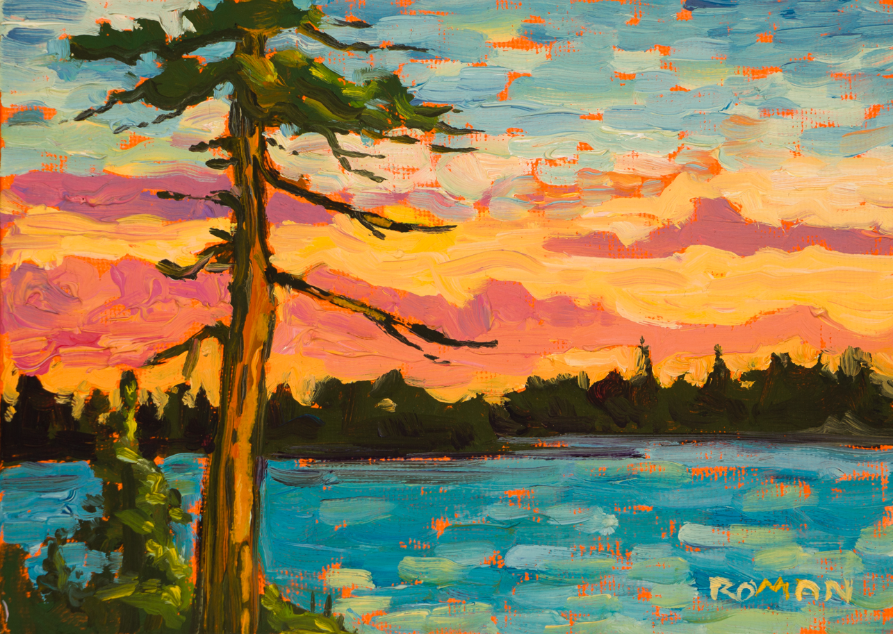 This serene 5x7 oil painting captures a solitary pine tree standing sentinel over a tranquil lake at sunset. The sky blazes with brilliant oranges, pinks, and purples, while the calm blue water reflects the fading light. The windswept pine, silhouetted against the glowing sky, creates a striking focal point, while a dark treeline frames the distant shore. The bold, expressive brushwork conveys both the peaceful solitude and the quiet strength of this lone tree.