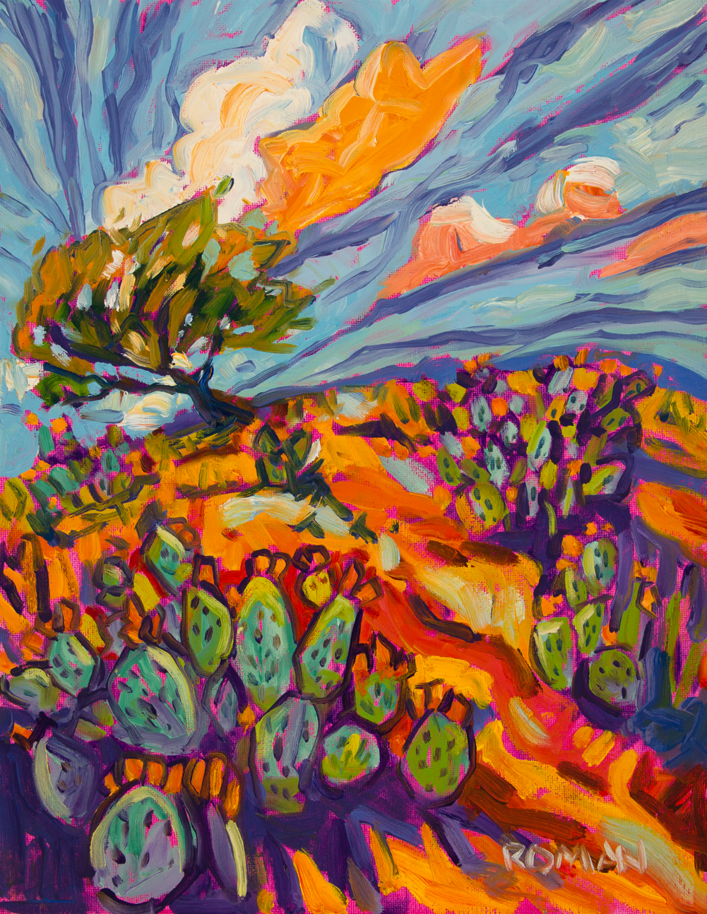 This exuberant 11x14 oil painting explodes with the vibrant energy of a desert landscape in full bloom. A windswept tree anchors the composition against a dramatic sky of swirling blue, orange, and cream clouds. The foreground bursts with life - prickly pear cacti in rich greens and blues mingle with brilliant orange, yellow, and purple wildflowers across red-orange desert soil. The bold, expressive brushwork creates a sense of wild, joyful abundance, celebrating the spectacular beauty of the desert in afternoon light.