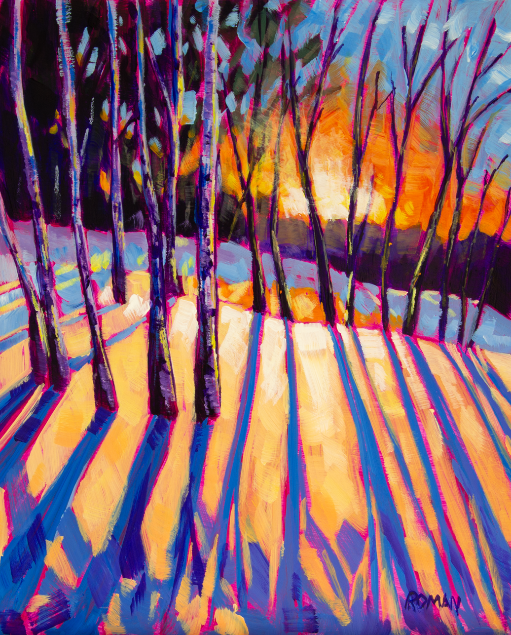 Winter birch trees cast long, colorful shadows across fresh snow as a brilliant sunset blazes through the trunks — warm golds and fiery oranges meet cool blues and purples in a dazzling display of light and shadow. The kind of late-afternoon winter scene that stops you in your tracks on a walk through the woods.