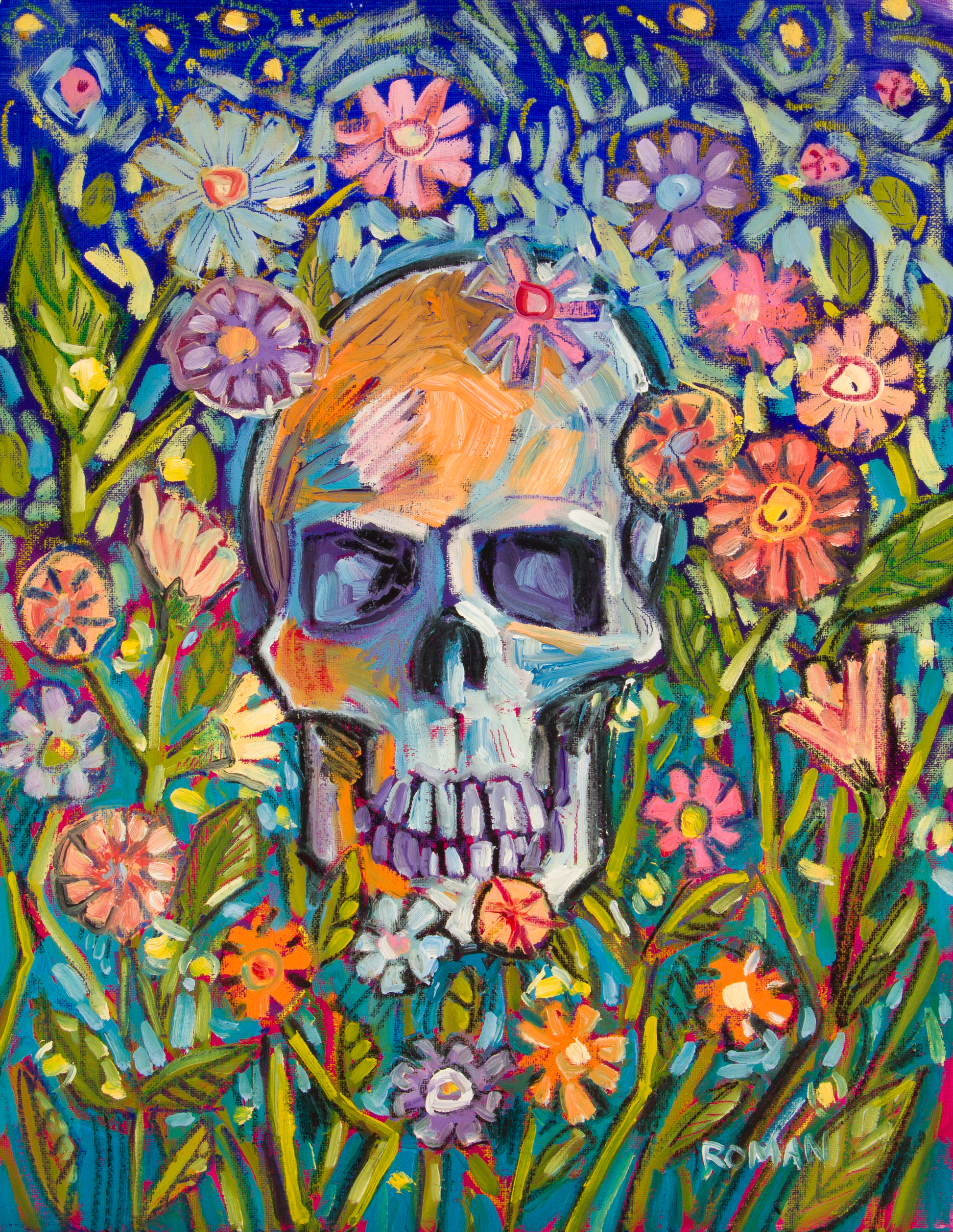 A vivid skull emerges from a brilliant tapestry of wildflowers — deep blues, teals, warm pinks, and fiery oranges — as spring returns to the world once more. Painted on a walk when the first songbirds of the season were calling to one another and the fishing boats were back out on the lake. A quiet tribute to a father who loved those same spring mornings.