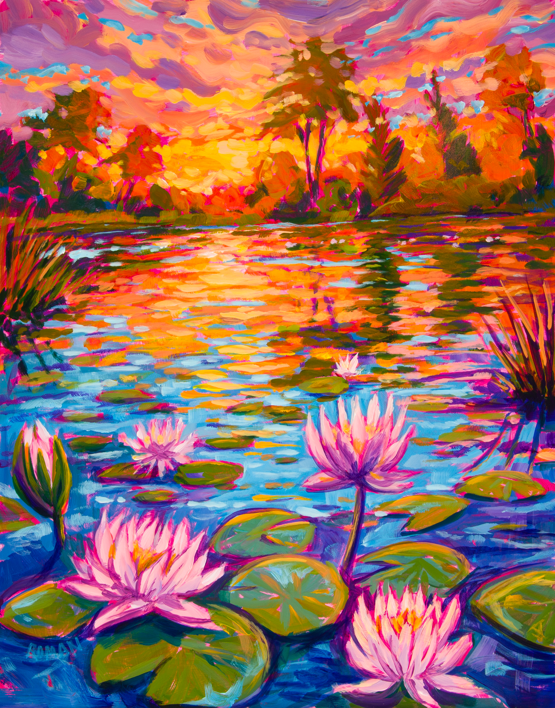 Water lilies bloom across a shimmering pond as the sun drops through a sky alive with pinks, corals, and golds. Autumn trees glow along the far shore while reflections dance across the blue water — a lush, joyful scene that radiates warmth and color from every brushstroke.